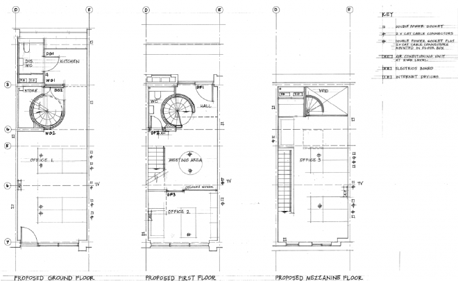 10/100 ethernet is very 1990s so we’re installing Cat6 Gigabit Ethernet cabling throughout the office. The internet line will terminate on the ground floor in a cabinet at the back, with trunk lines running up to a dedicated switch on each level. Cabling will run through the walls to various ports, usually alongside power outlets. At the desk areas, an in-floor box will provide connectivity and power to each workstation.