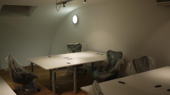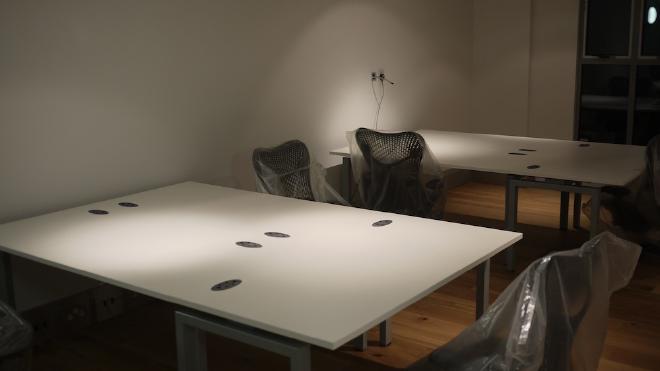 Throughout the building there are connectivity points on the walls, combined with mains electricity. There are also under-floor panels which are flush with the floor when closed but have small slots which open to allow plugs (power and gigabit network) to hide inside the panel, avoiding any cable mess and tripping hazards.