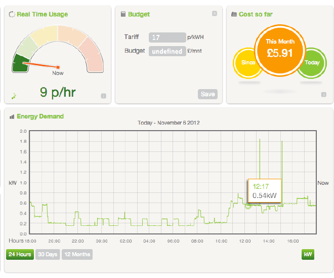 After some research, we started using an Efergy wireless electricity monitor. This simply requires you to set up a measuring device onto one of the cables from your meter and it then transmits the real time usage to a monitoring device you can set up somewhere. They clip onto the outside of the wiring so there’s no danger or electrician required. Input your supplier cost per unit and it then gives you a live cost per hour output.