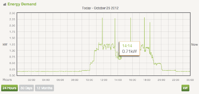 From this we can see the patterns when people arrive in the office, when lunch starts (we all eat the same time) and when things like the microwave are in use. Everyone has a Macbook + Cinema Display and from the data it looks like each person uses 0.20kWH, which costs about £0.03 per hour. This is with a single overhead spotlight per desk and no air con (it’s winter now), which is quite a bit more expensive.